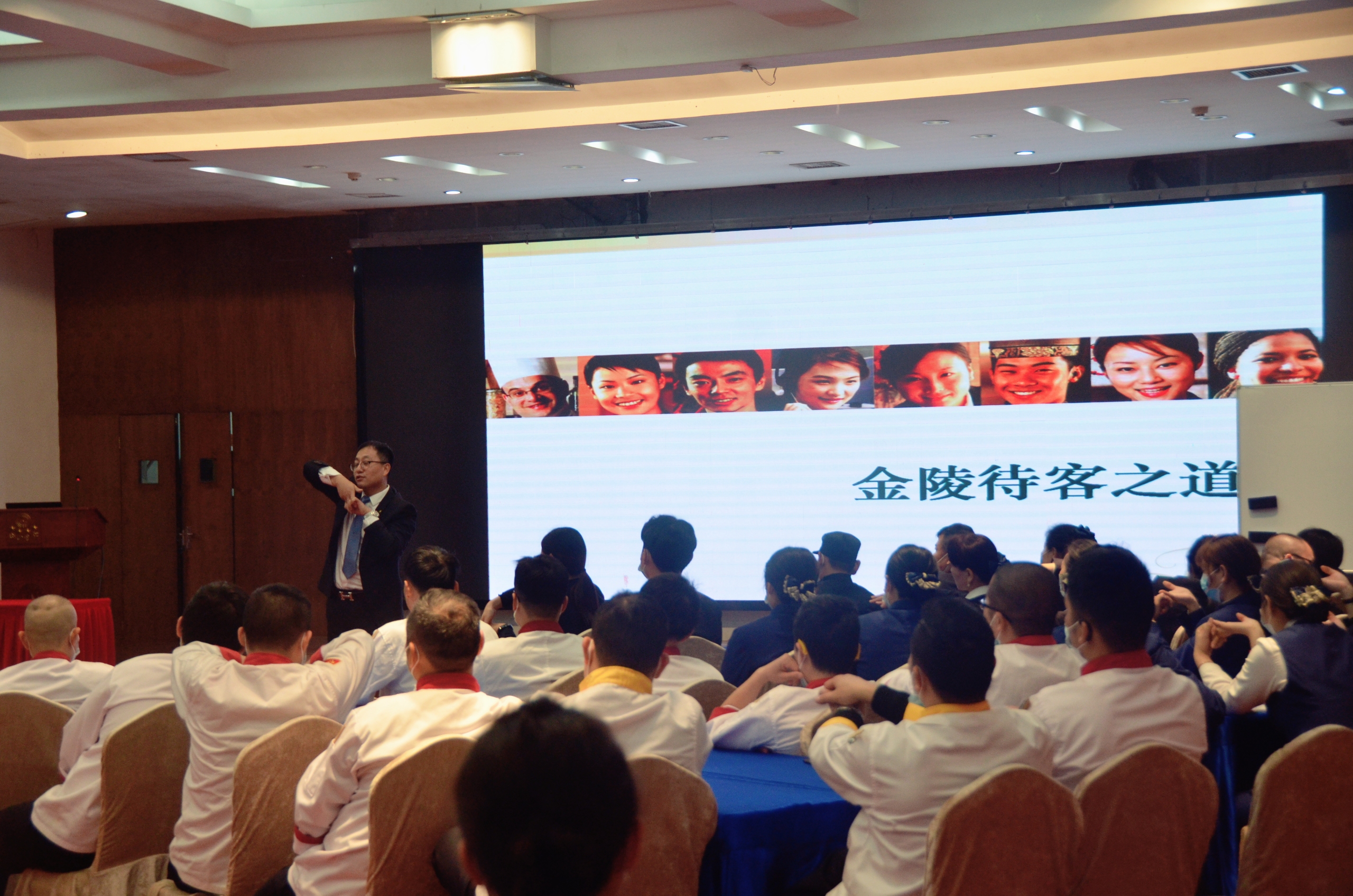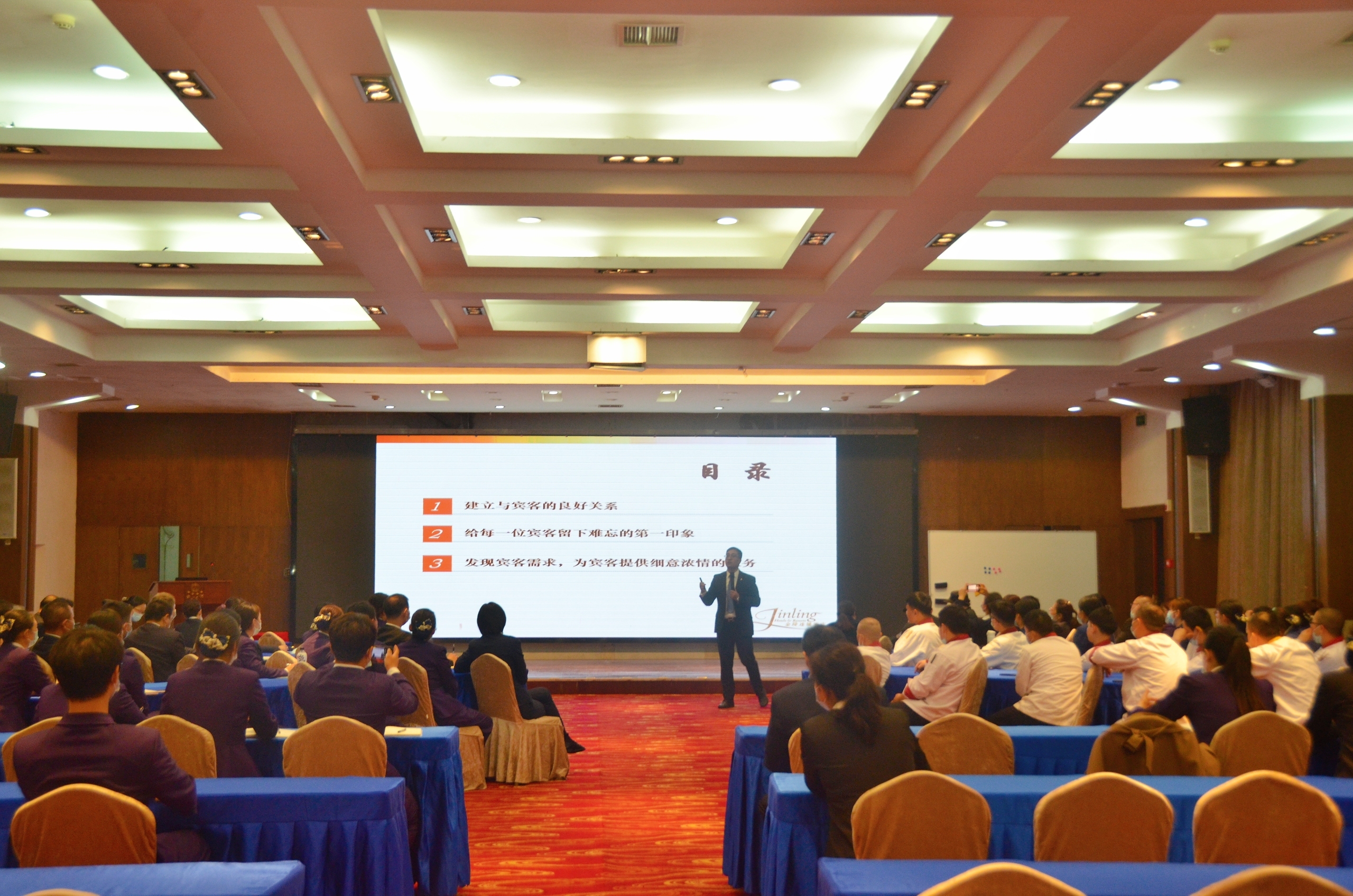 为进一步提高宾馆的接待水平和服务质量,2021年11月3日,宾馆邀请南京金陵文旅酒店管理公司运营总监温秀蓉、金陵酒店管理公司金陵连锁培训顾问徐中元一行在礼堂对全体员工进行了《金陵待客之道》主题培训。