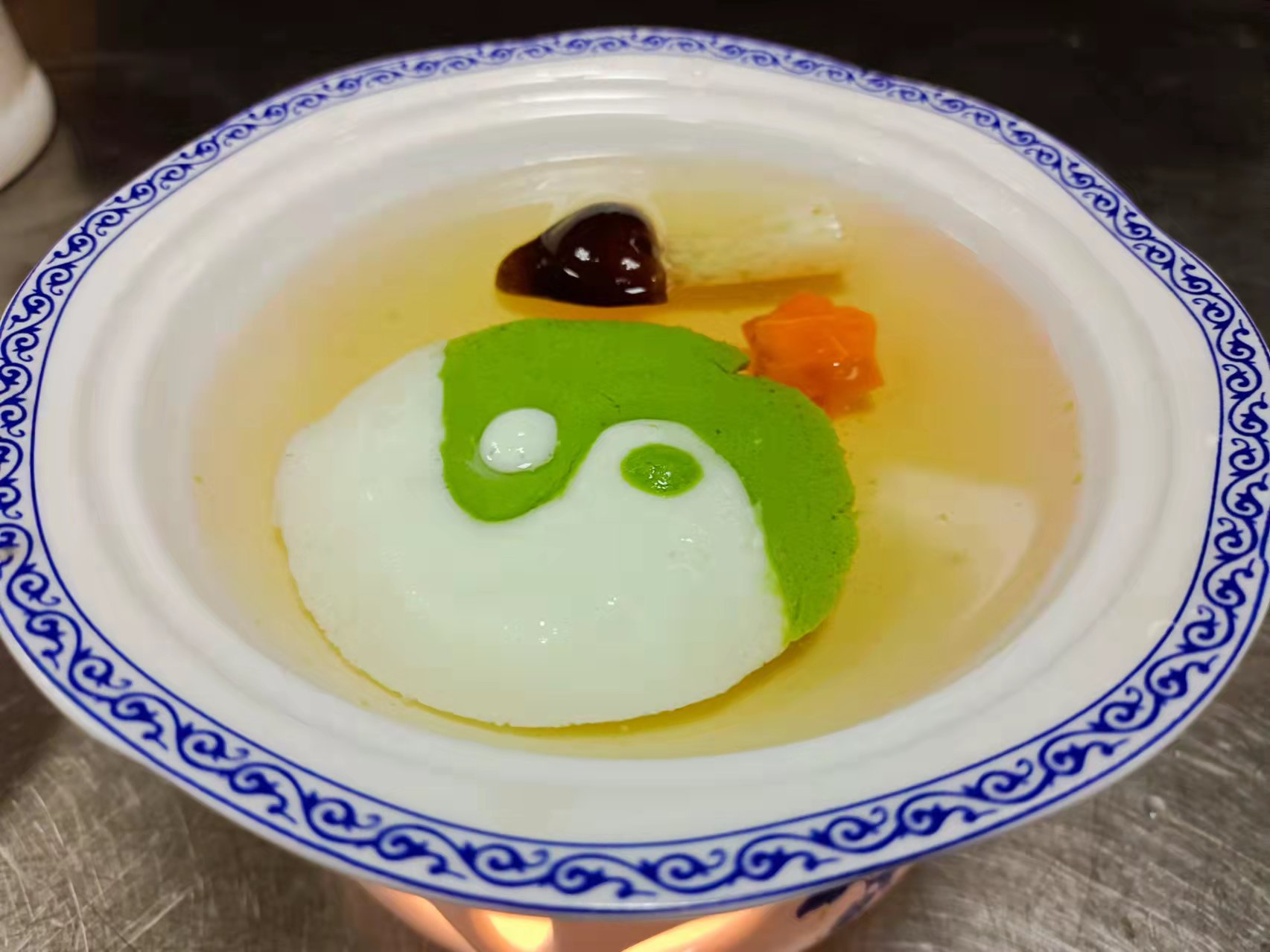 本次竞赛中式烹饪项目主要有两道菜肴,一道自创招牌菜,一道指定热菜。我馆汪金平第一道自创菜名为“太极鱼羊鲜”,主材以羊肉和鱼肉为核心,用鲜榨的菠菜汁浸泡新鲜羊肉,中和羊肉膻味的同时点亮菜品色彩,搭配鲜嫩的桂鱼肉,组合出绿白相融的太极球,融合铁山独特的烹饪技艺,最终才得以呈现出这道“太极鱼羊鲜”的菜品。