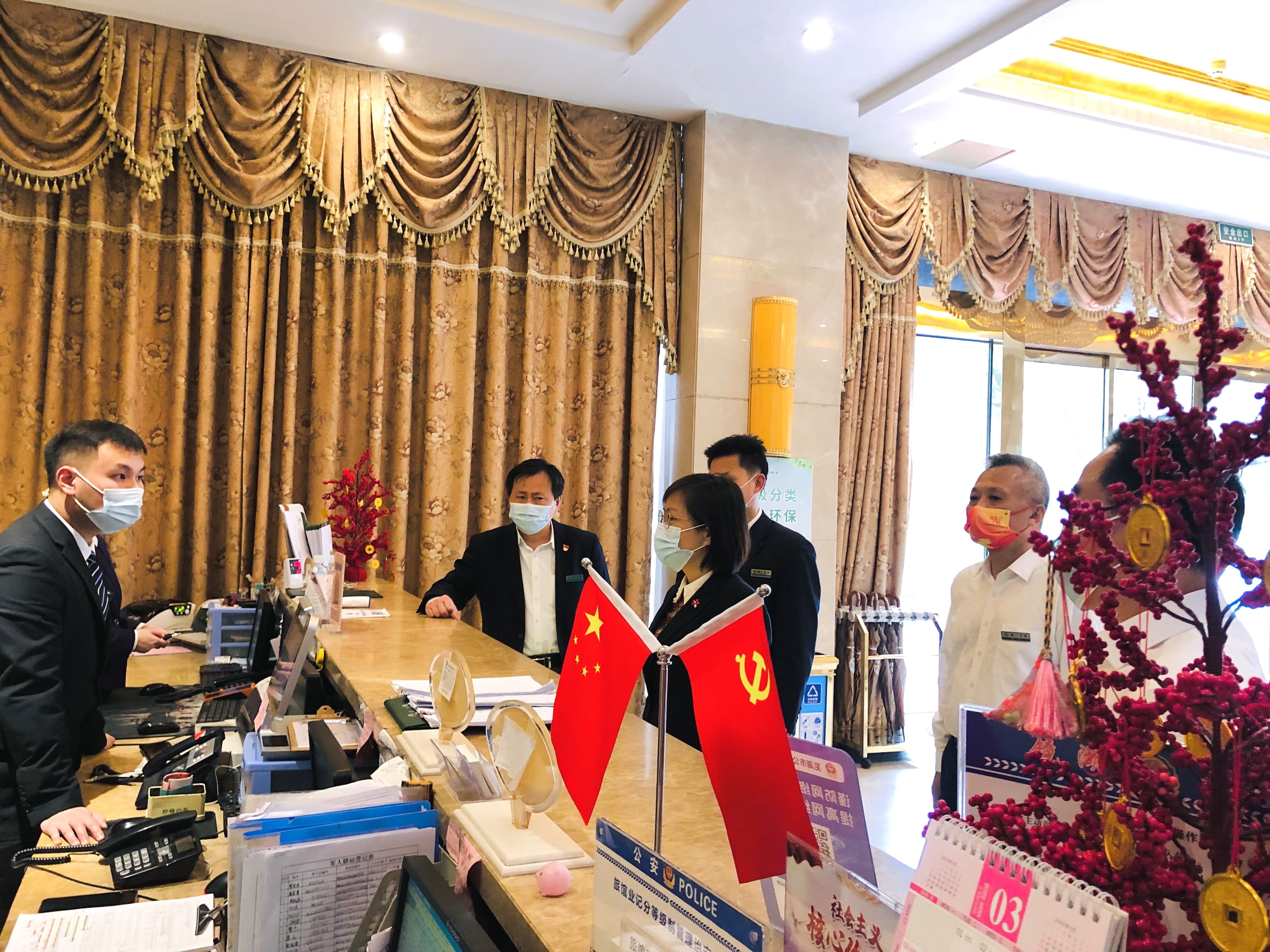 下午2:30,宾馆领导班子一行来到各部门检查疫情防控工作落实情况,党委书记、总经理汪春玲带领班子成员及相关人员来到安全部门卫室、房务部总台、六栋大厅,餐饮部吧台等重点岗位,检查所有进入宾馆人员信息登记情况,要求所有进入宾馆人员必须佩戴口罩、测量体温并进行登记。对于入住人员必须严格查验旅客健康码、行程卡及48小时内核酸检测证明,严格落实扫码、戴口罩、消毒等常态化疫情防控措施。汪春玲指出,要强化联防联控,严格落实有关要求,认真细致开展入住人员信息摸排登记工作,特别是针对来自疫情中高风险地区人员,消除疫情输入隐患。同时叮嘱员工做好个人防护,非必要不离芜、不参加聚集性活动,加强疫情防控和安全知识宣传,强化个人是“健康第一责任人”理念。