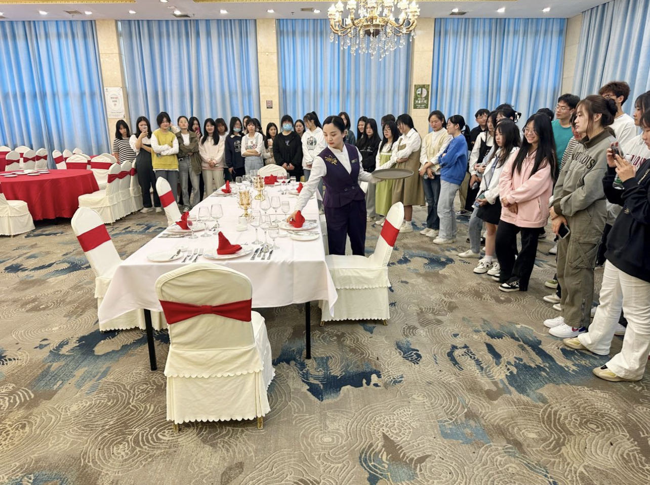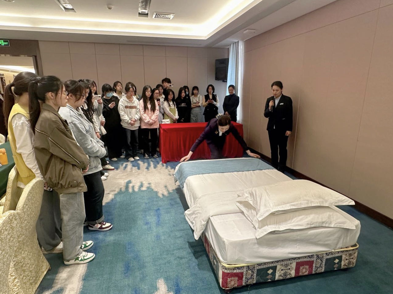 为了加深同学们的认知,宾馆安排了参会经理介绍宾馆的基本情况、文化底蕴、历史传承及生动形象的视频宣讲,精心安排了房务部王玲玲与餐饮部梁莹两位业务骨干,依次为同学们进行客房铺床和西餐、中餐摆台的业务技能展示。王玲玲演示了客房铺床的规范标准,并详细讲解了操作要领及技巧,娴熟而优美地完成铺床单、套被子、整理床铺等一系列铺床程序,赢得同学们的一致赞叹。摆碗碟、放刀叉、叠餐巾……这些看似简单的动作,其实都有着严格的操作流程和服务规范。同学们目不转睛地盯着梁莹每一个操作动作和细节,细心地录像记录,以便日后学习。针对同学们提出的问题与疑惑,现场一一进行了解答和指导。