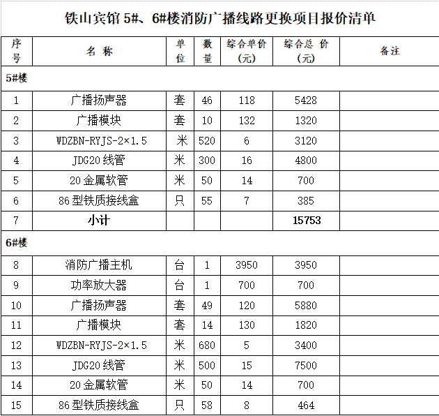 一、项目名称:芜湖市铁山宾馆有限公司5#、6#楼消防广播线路线路更换项目