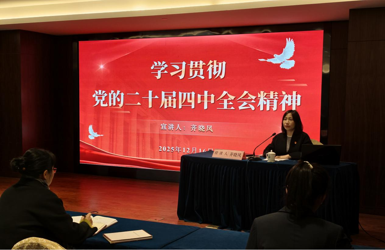 为深入学习贯彻党的二十届四中全会精神,12月16日上午,铁山宾馆召开了学习贯彻党的二十届四中全会精神宣讲报告会。宾馆党委书记、总经理齐晓凤作专题宣讲,宾馆及子公司中层以上管理干部、全体党员参加学习。