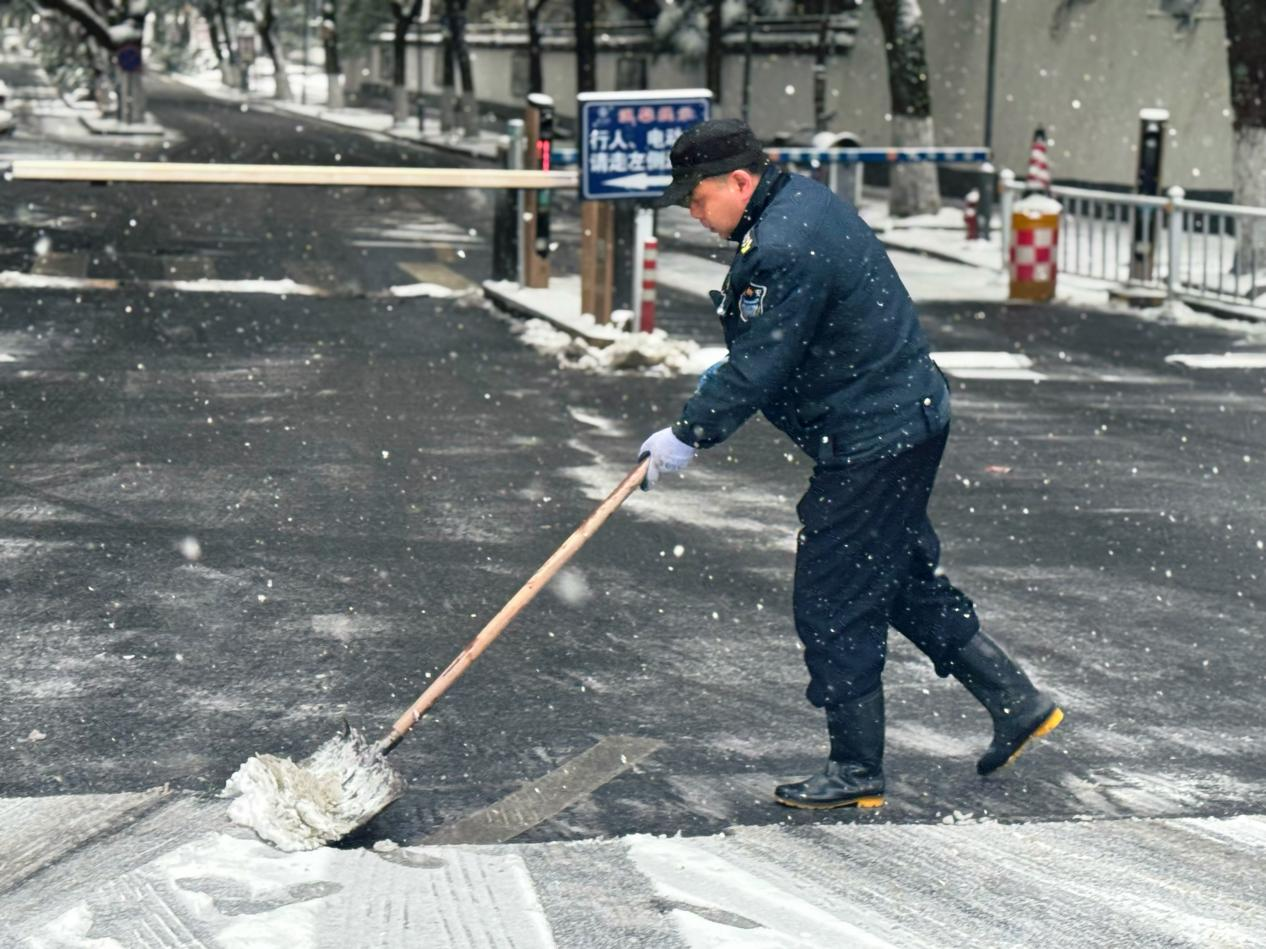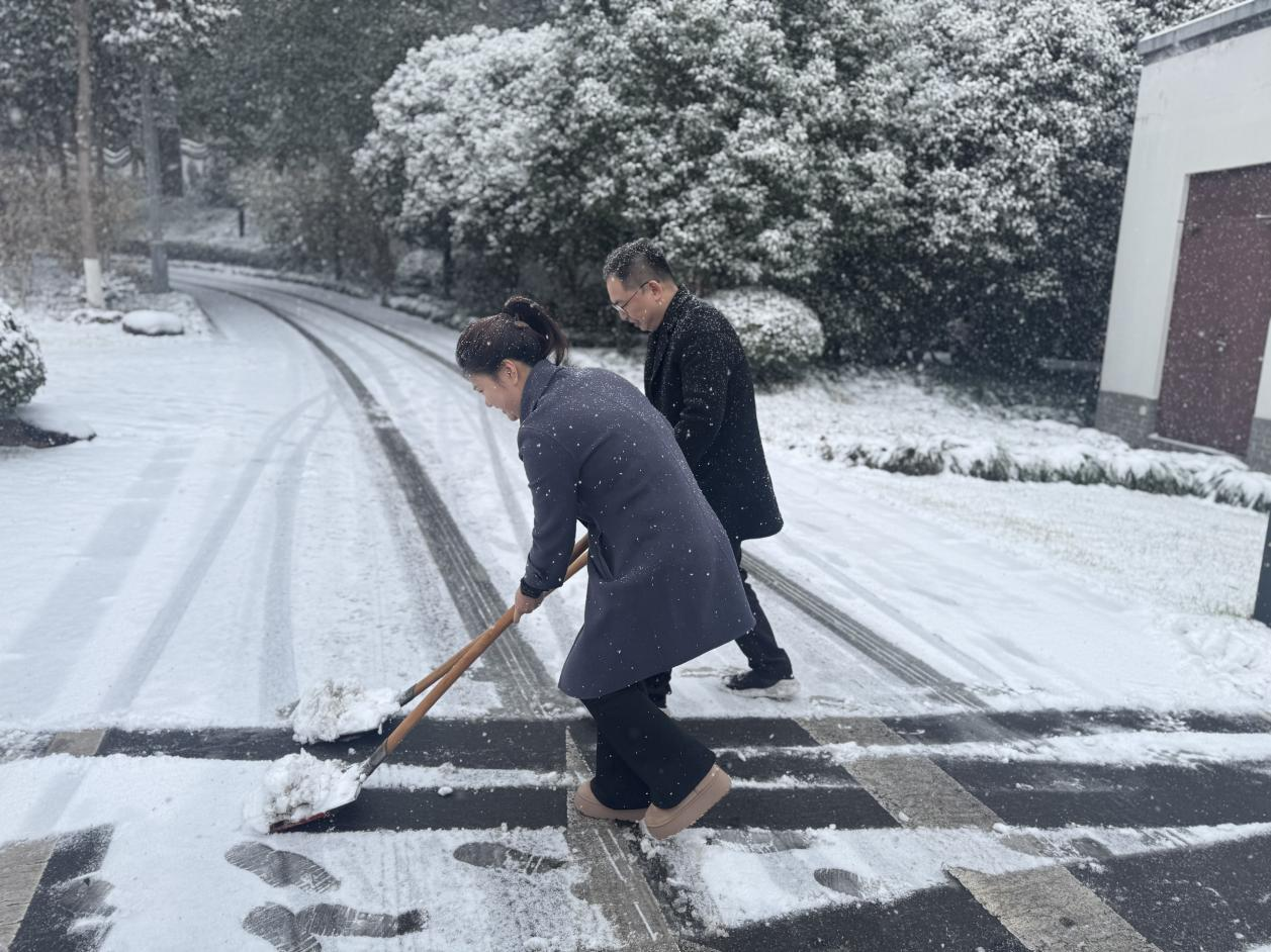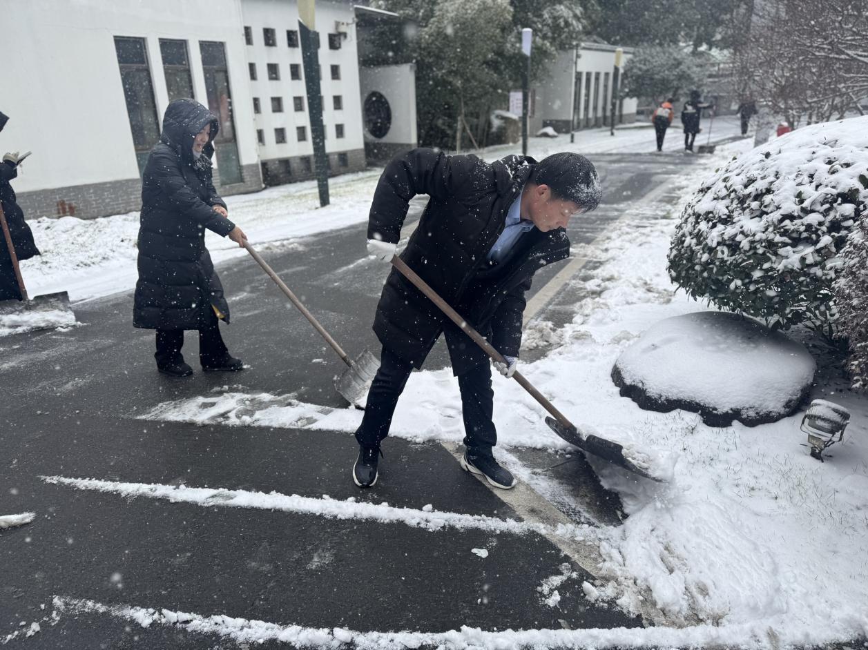 此次行动聚焦重点区域,围绕主干道、车库入口等关键点位,开展全方位、无死角的积雪清扫和薄冰铲除作业。全体参与人员不畏严寒、分工协作,党员干部带头冲锋在前,大家接力跟进补位,挥舞着铁锹、扫帚等工具有条不紊推进作业,不放过任何一处安全隐患,用汗水打通宾客出行“安全通道”,也让“红心服务”的铁山温情在寒风中传递。