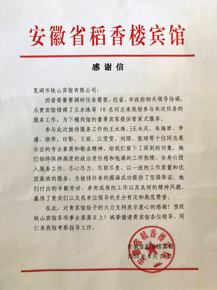 接待工作完成后,稻香楼宾馆也在第一时间发来感谢信,不仅对于铁山宾馆的大力支持表达衷心的感谢,更高度赞扬了王水珠等10名同志的表现。信中特别指出,正是她们付出的辛勤劳动、卓有成效的工作,以及良好的精神风貌,赢得了到访贵宾及稻香楼宾馆领导的充分肯定和一致好评。