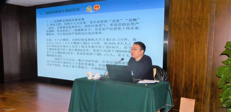 徐彬主任围绕“筑牢思想防线 远离腐败行为”主题,以“全面从严治党”为切入点,从当前反腐斗争的形势、腐败行为的种类、腐败行为的原因及预防三个方面进行阐述,凸显了中国共产党对惩治腐败一以贯之的坚定信念,明确了共产党人应该保持的政治本色,分析了易诱发腐败的原因、思想、行为,提出了每一位党员干部廉洁从业的要求。