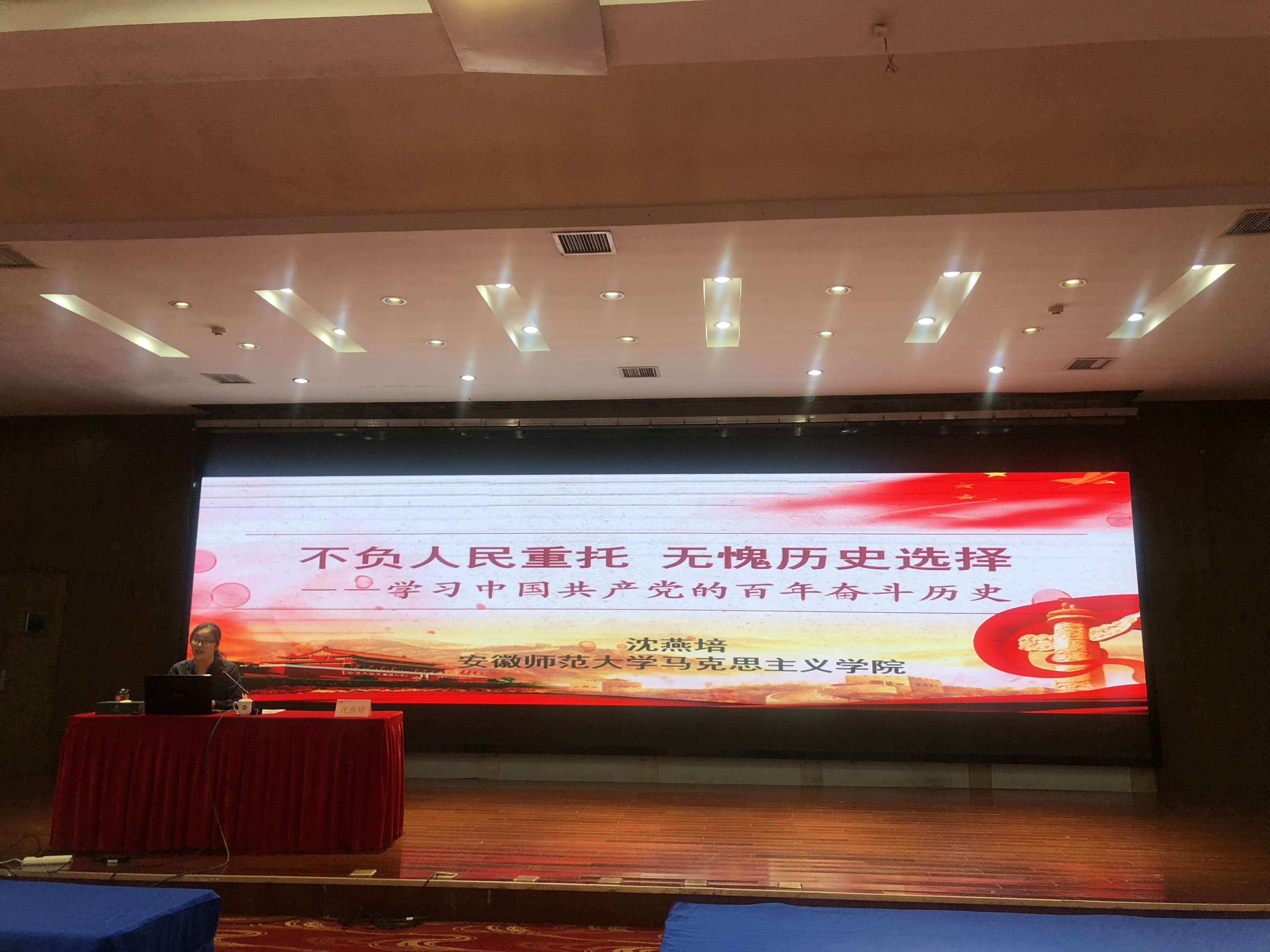 根据宾馆党史学习教育实施方案工作安排,引导宾馆广大党员、干部进一步深刻铭记中国共产党百年奋斗的光辉历程,做到学史明理、学史增信、学史崇德、学史力行,增强“四个意识”、坚定“四个自信”、做到“两个维护”,2021年5月11日下午,宾馆邀请安徽师范大学马克思主义学院副教授、硕士生导师沈燕培来馆上了一堂党史专题教育课。