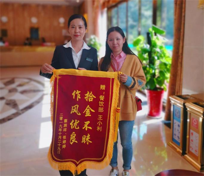 10月29日中午,这对刚刚结为连理的新人再次来到铁山宾馆,找到当天拾到红包的王小利,向其献上了一幅绣有“拾金不昧,作风优良”八个字的锦旗,表达感激之意,并连连称赞铁山宾馆不愧是芜湖的国宾馆,员工素质一流,作风一流。王小利用行动和她的善举给所有员工上了一堂生动的道德公开课,她在意外之财面前没有片刻犹豫,而是立刻交还失主,给在场的员工树立了榜样和标杆,无形之中给大家作出了表率,她在平凡的岗位上用不平凡的举动感染着身边每一个人,令人敬佩,值得学习。
