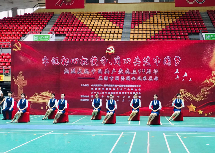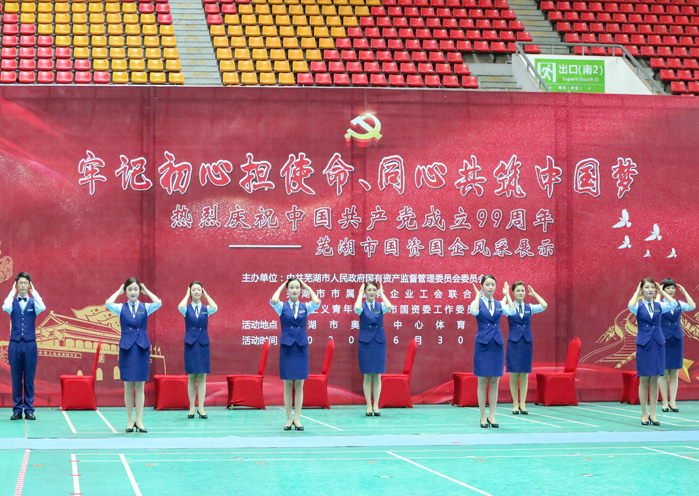 为热烈庆祝中国共产党成立99周年,重温党的历史,回顾党的光辉历程,讴歌党的丰功伟绩和辉煌成绩,发扬党的光荣传统,6月30日下午,在芜湖市奥体中心举办了芜湖市国资国企风采展示活动。本次活动的主题是“牢记初心担使命,同心共筑中国梦”,由中共芜湖市人民政府国有资产监督管理委员会、芜湖市属国有企业工会联合会、共产主义青年团芜湖市国资委工作委员会主办,芜湖市财政局、国资委及市属国有企业共同参加了此次庆祝活动。